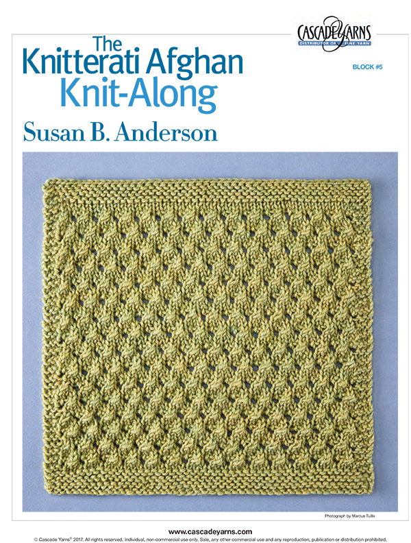 Block 5 is much better than the last four. I follow Susan B. Anderson’s blog, and when I saw this block was designed by her, I knew it would be better. This block is simple, but the texture looks very cozy. Susan’s designs are all classic and cozy. So, I’ll dig out some yarn and knit up this one. This afghan, so far, gets a 40% approval rating from me. Ha! We’ll see how the rest of it goes.