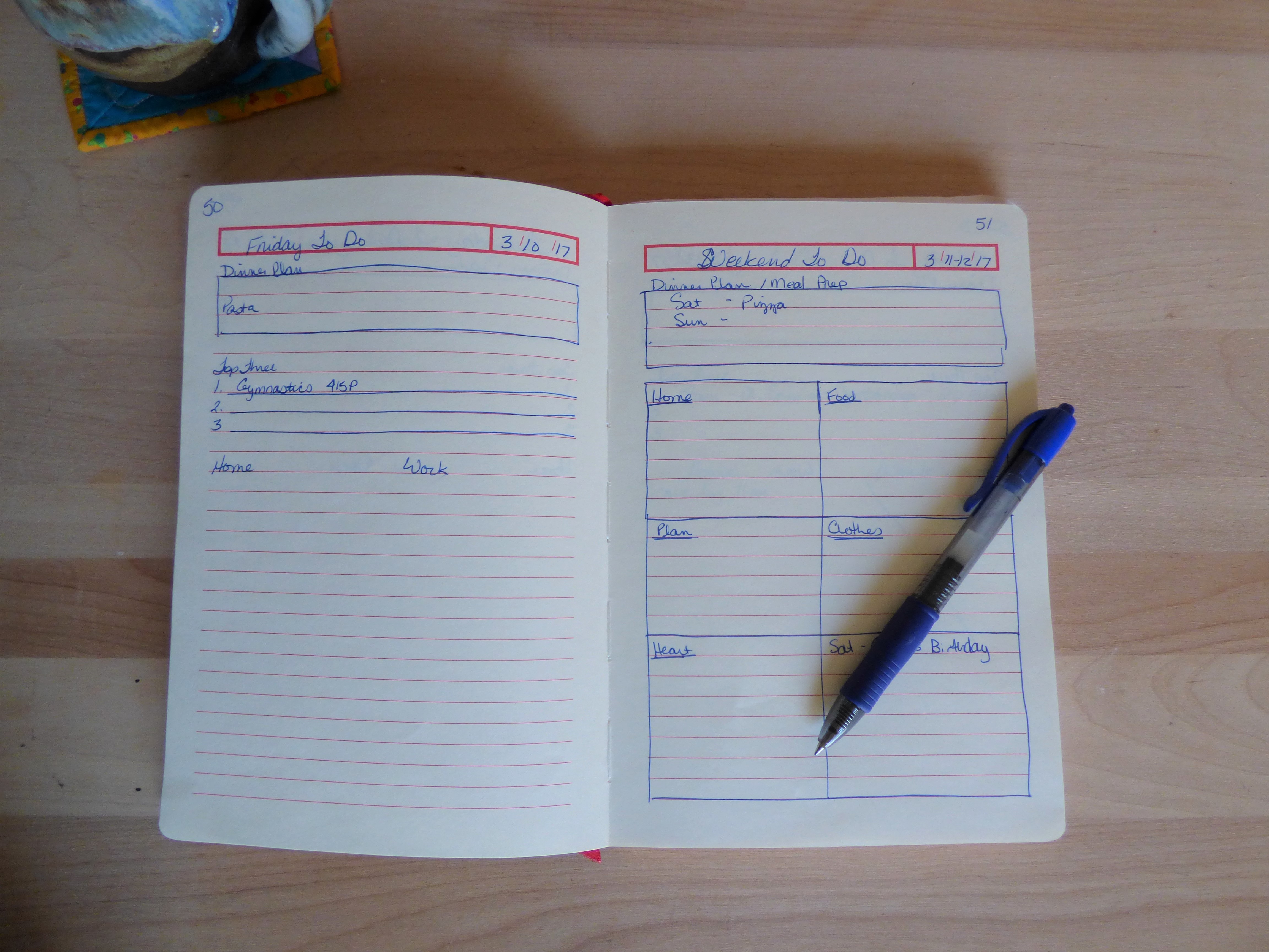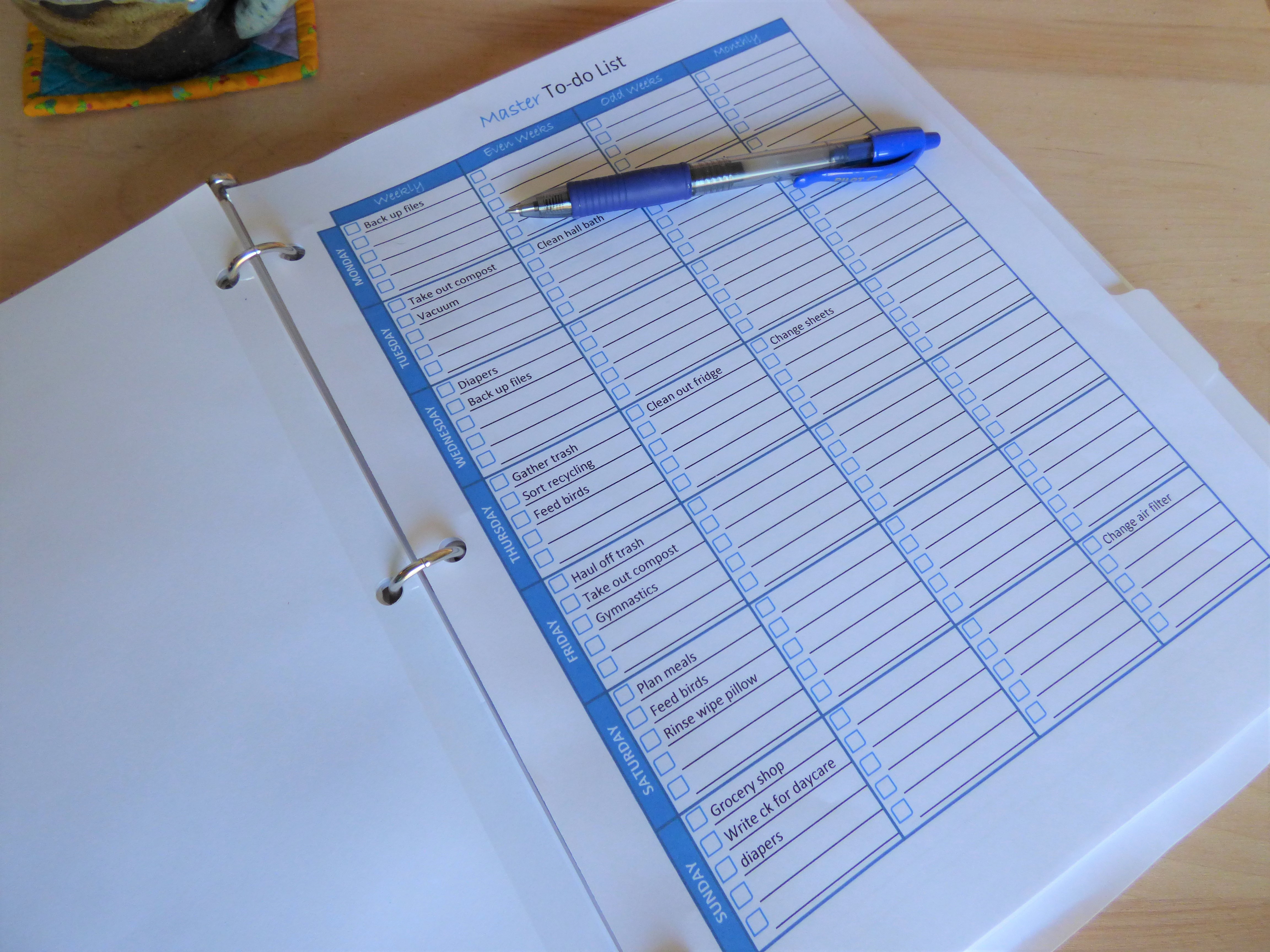 For overall planning, I’ve made a weekly Master To-Do list. There are things I need to do each week, some that I want to do every other week and some that I need to do monthly. This page helps me keep up with things I need to do and remember to put them on my daily pages.