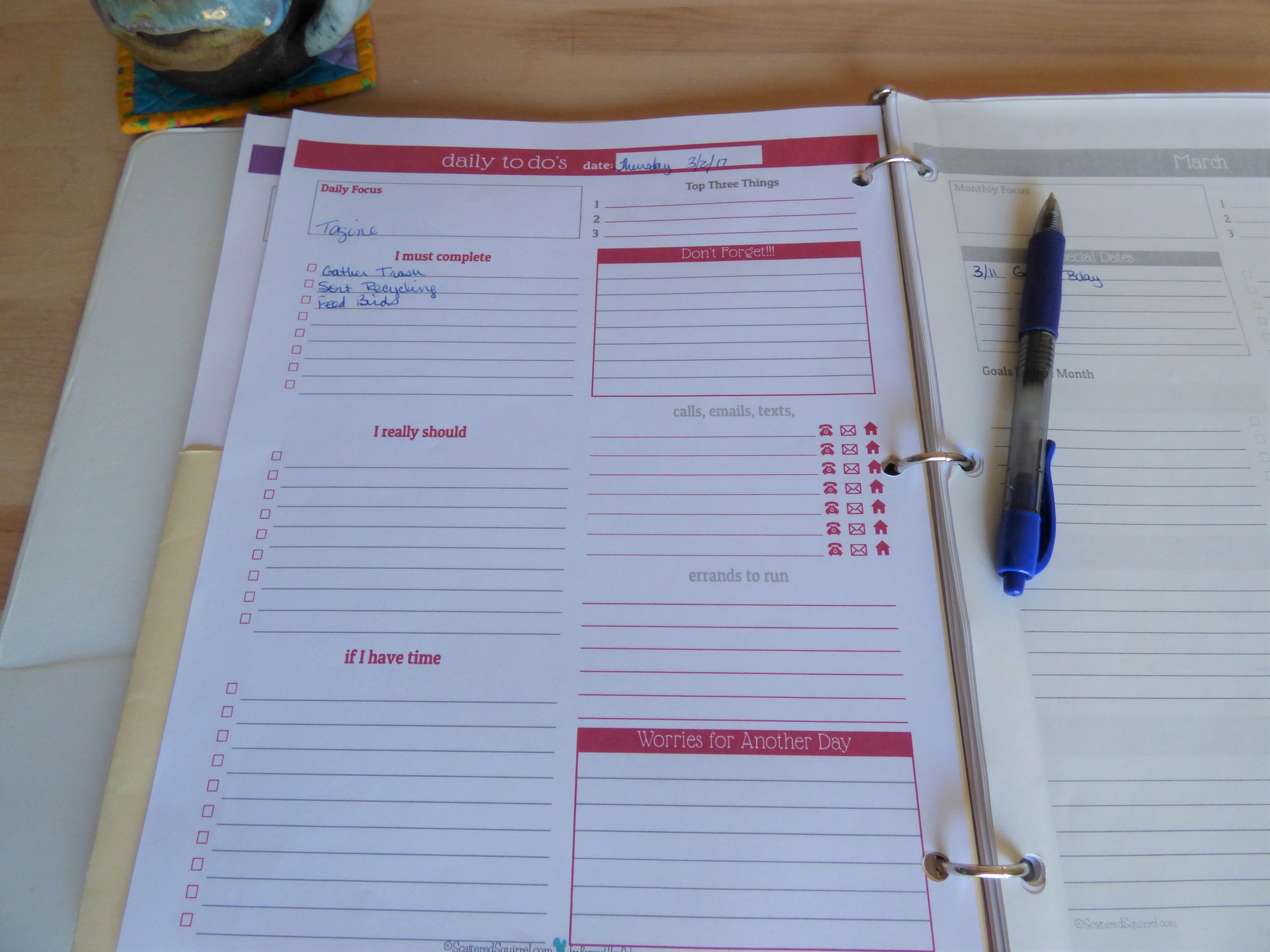 I spent several evenings searching for printable pages for a planner. I found some that I thought would work for me from Scattered Squirrel. I wanted a full-page planner because I can read my writing better when I don’t have to write tiny. I bought a 1/2″ binder to put my planner in as well as some pocket dividers and tabbed dividers.