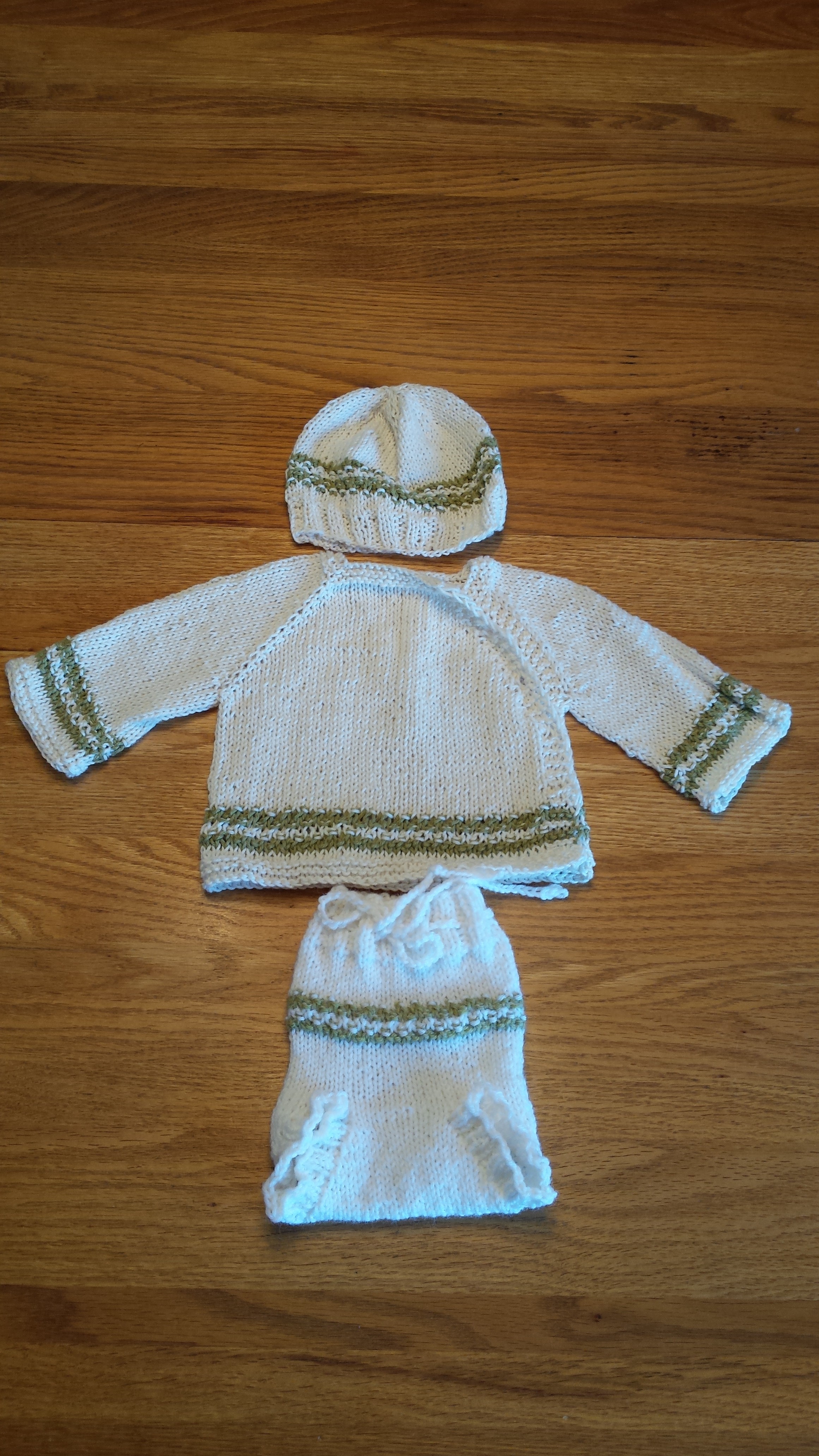 The hat and cardigan are made with Knit Picks CotLin yarn in white and celery. The cotton and linen blend will be enough to take the chill off, but won’t overheat the baby. Even though Lollypop will be a spring baby, there’s at least blackberry winter (and possibly dogwood winter) in which a sweater will be necessary.