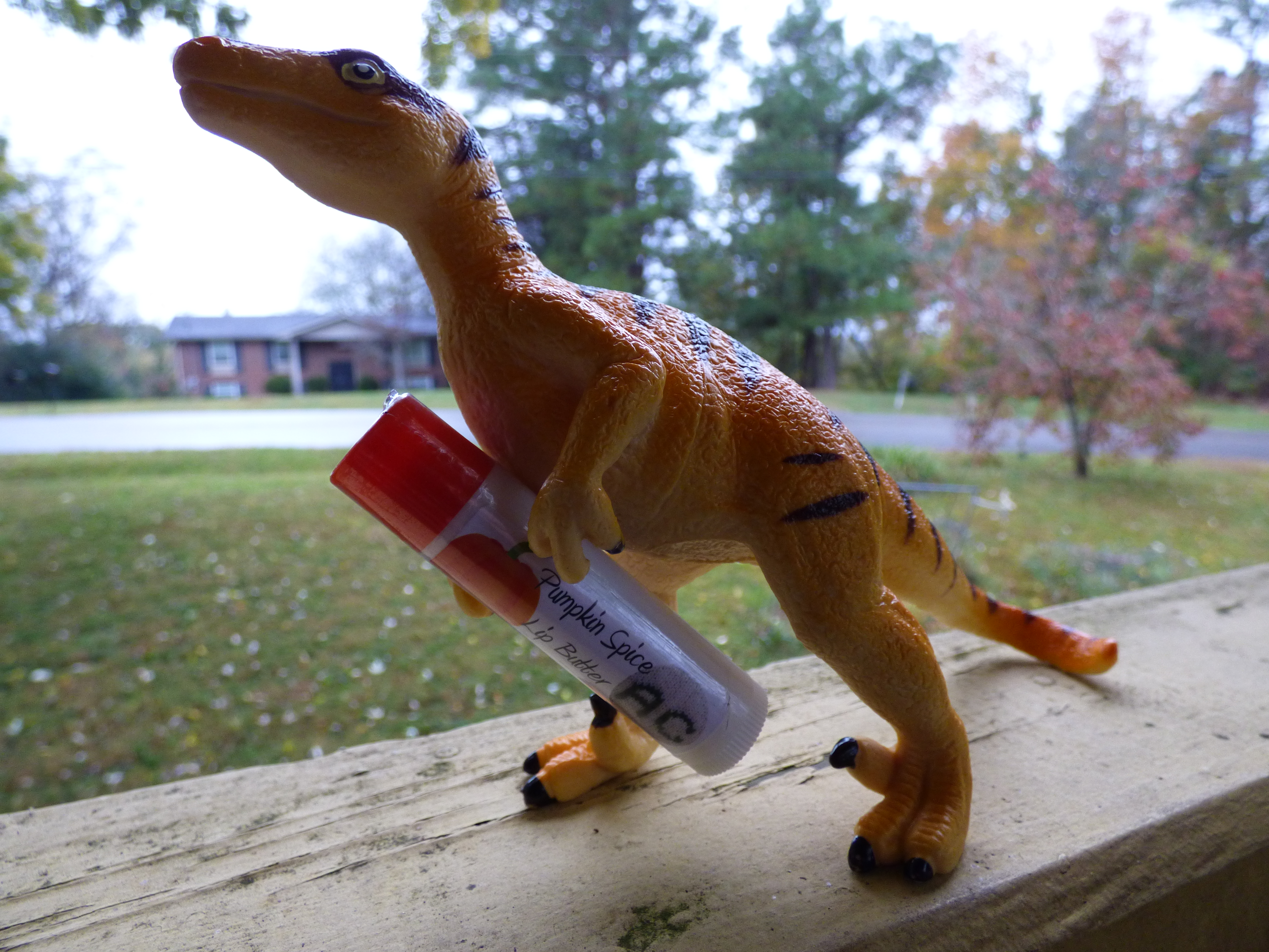 The Pumpkin Spice is so good, even a velociraptor keeps it on hand! (Thanks to Jellybean for sharing his dinosaur toy. 🙂 )